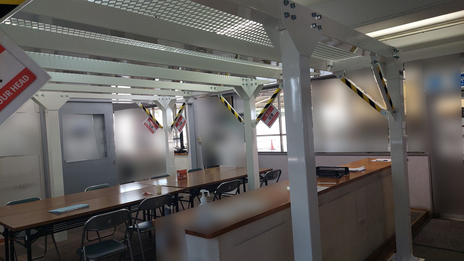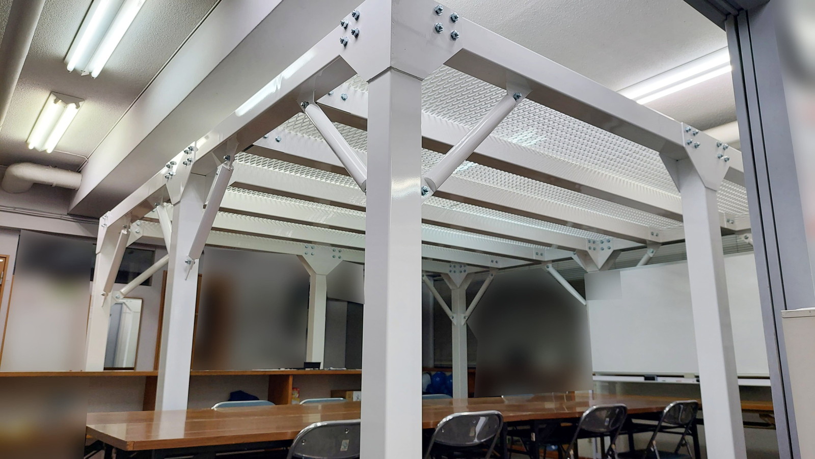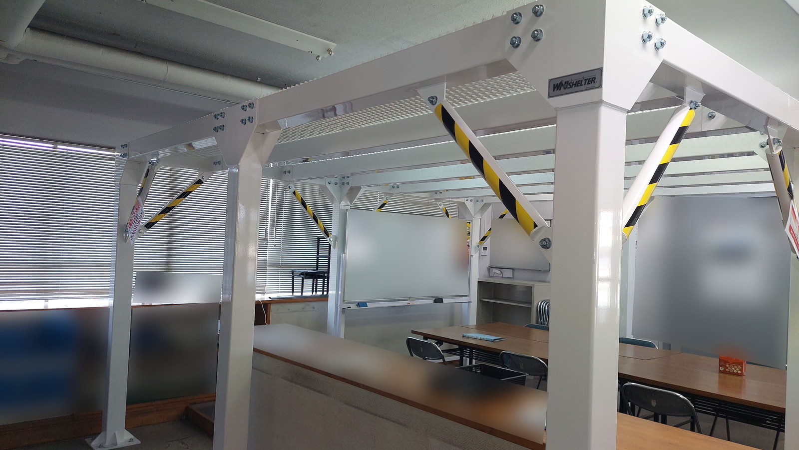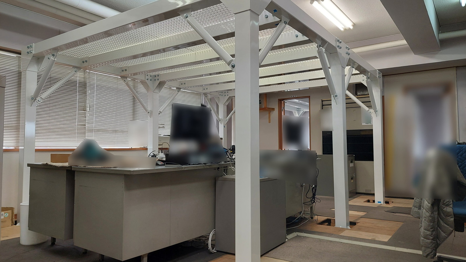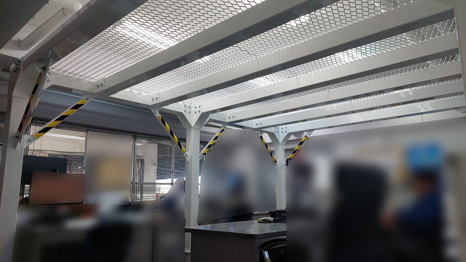 事務所および会議スペース上部に、やぐら型鉄骨シェルターを設置しました。従業員の頭上を守る配置を行い、業務中でも即座に安全確保が可能です。