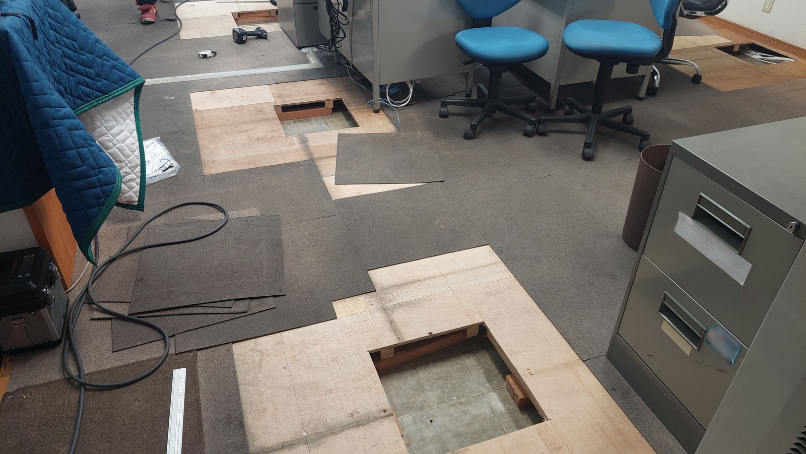 アンカー打設のため、床下の基礎部分を調整しながら施工。約100mmの上げ床施工にも対応し、既存環境に適合させています。